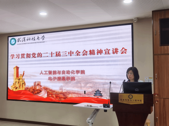 武科大網(wǎng)訊(通訊員 吳廣良)為推動集團干部師生全面學(xué)習、全面把握、全面落實黨的二十屆三中全會精神,堅定不移把黨的二十屆三中全提出的目標任務(wù)落到實處,引導(dǎo)廣大師生把思想和行動統(tǒng)一到黨的二十屆三中全會精神上來11月15日,馬克思主義學(xué)院副教授梅玉婕來院作黨的二十屆三中全會精神宣講專題報告。報告會由永利集團88304官網(wǎng)黨委書記冒穎主持,永利集團88304官網(wǎng)、電子信息學(xué)院師生130余人聽取了報告會。