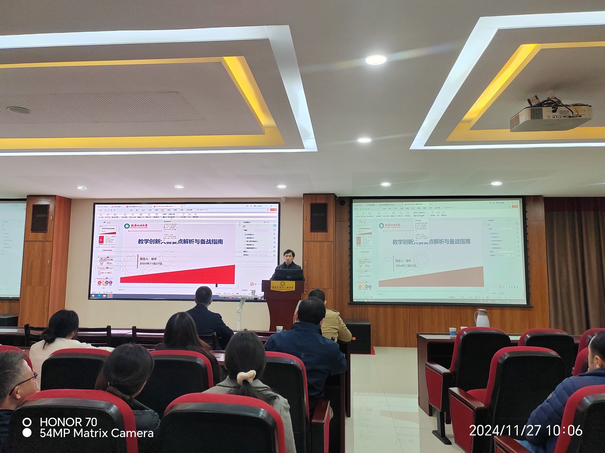 為迎接教學創(chuàng)新大賽,提升教師教學能力,提高教學創(chuàng)新水平,11月27日,學院特邀請全國教學創(chuàng)新大賽一等獎獲得者、機械學院侯宇教授做《教學創(chuàng)新大賽要點解析與備戰(zhàn)指南》專題培訓,學院黨委書記冒穎、40名教師參加培訓,培訓由學院副院長程磊主持。
