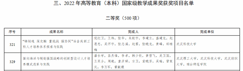 7月24日,教育部發(fā)布關(guān)于批準2022年國家級教學成果獎獲獎項目的決定。我校吳懷宇教授參與完成的“‘鑄鋼魂 深交融 重挑戰(zhàn) 強協(xié)同’冶金類新工科人才培養(yǎng)體系探索與實踐”喜獲高等教育(本科)國家級教學成果獎二等獎。