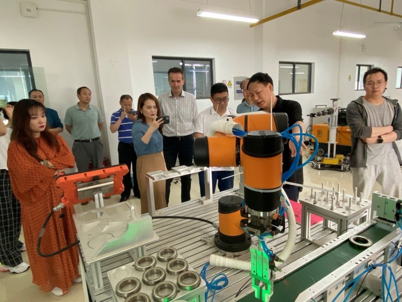 參觀過程中,閔華松教授團隊向參觀人員展示了機器人技術實訓平臺、書法機器人、移動雙臂機器人、水果采摘機器人、新能源汽車自動充電機器人等項目,并對這些項目的相關技術和應用價值進行介紹。目前,機器人可代替或協(xié)助人類完成各種工作,并廣泛應用于制造業(yè)領域。機器人已成為先進制造技術領域不可缺少的自動化設備。