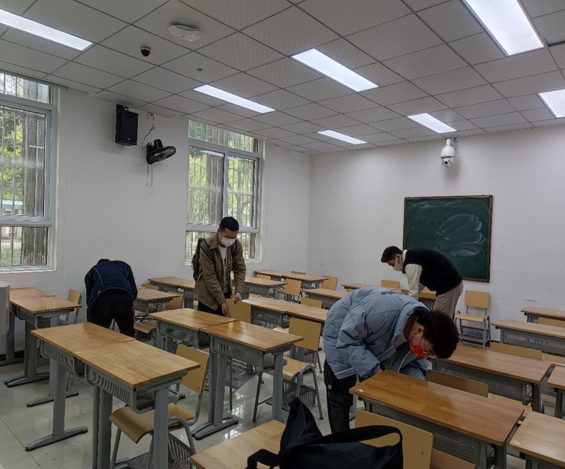 我們對(duì)教三樓各個(gè)教室進(jìn)行了查看,發(fā)現(xiàn)許多教室存在桌椅擺放不規(guī)整,課桌內(nèi)還留有部分垃圾。為此我們將成員分成了四組對(duì)每一層樓進(jìn)行清理,每一組中一人負(fù)責(zé)教室抽屜垃圾處理、兩人負(fù)責(zé)課桌椅擺放、還有一人負(fù)責(zé)黑板擦拭等工作。組內(nèi)成員的積極性很高,在大家的互幫互助下,經(jīng)過一上午的處理,各個(gè)教室的衛(wèi)生環(huán)境得到了改善。